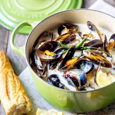 The coconut milk infused with wine and mussel juice makes and incredible broth – you will be very tempted to drink this straight out of your bowl and we say “Go ahead – tip that bowl” !!!